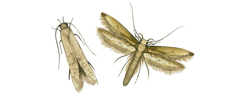 🔵Имаго. Бабочка 11-19 мм в размахе крыльев. Длина тела до 9 мм. Передние крылья узко ланцетные, желтовато-серые, заостренные, иногда с двумя удлиненными черными пятнами посередине и черноватым пятном у заднего угла; задние крылья светло-серые с бронзовым отливом и коричнево-серой бахромой. Цвет бабочек похож на цвет зерна пшеницы.