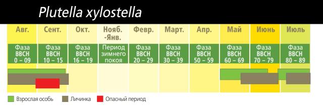 🔷 Капустная моль уязвима только в возрасте взрослой бабочки, в период отрождения и развития личинок 1-2 возраста, то есть когда вредитель появляется на поверхности листа. Ни в стадии куколки, ни в стадии более взрослой личинки уничтожить вредителя практически невозможно, поэтому важно опрыскивать растения в период развития личинок 1-2-го возраста.