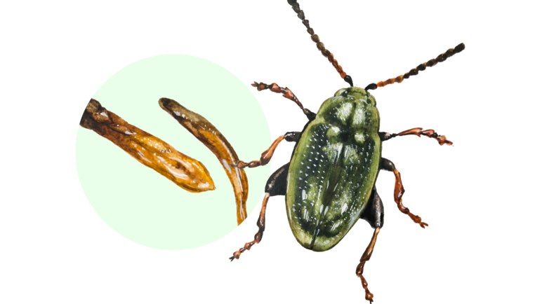 Жуки появляются весной в конце марта-апреле при температуре 8-9°С и питаются паренхимой листьев.