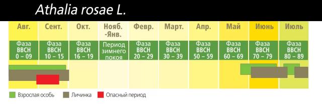 Оптимальная температура для яйцекладки: +18– +20°С. При высоких температурах наблюдается очень быстрое развитие ложногусениц. Рапсовый пилильщик дает 2–3 поколения в год.
