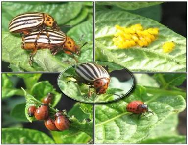 🔷 Зимует жук в почве преимущественно на участках из-под картофеля. Весной, при прогревании почвы до 14-15°С жуки выходят на поверхность и приступают к дополнительному питанию. Они повреждают листья картофеля, а также томаты, баклажаны, перец и другие культурные и дикие пасленовые растения. Средняя плодовитость самок около 500 яиц, но при благоприятных погодных условиях они могут отложить до 2400 яиц. На развитие одного поколения колорадского жука требуется сумма эффективных температур в 335°С при пороге около 12°С. В северных районах развивается 1 поколение, в южных – 2-3.