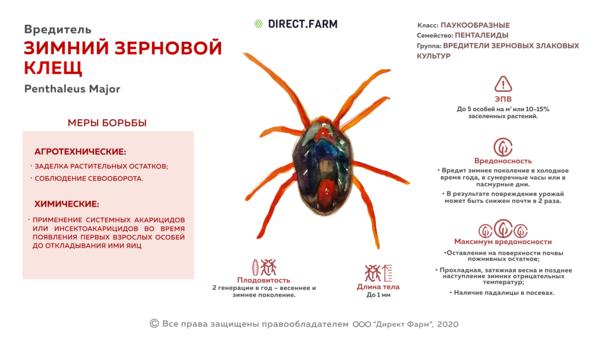 Хлебный клещик – вредитель злаковых культур. Встречается в зерновой массе, так как является полевым вредителем растений и в зернохранилище попадает со свежеубранным зерном