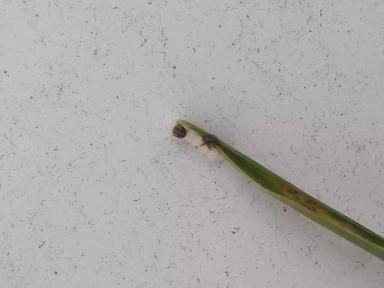 🔶На молодых злаках вызывает увядание центрального листа (сходное повреждение наносит шведская муха) или всего побега; на более взрослых растениях происходит спиральное скручивание в верхнем узле колосоножки и частичная или полная бесколосость.