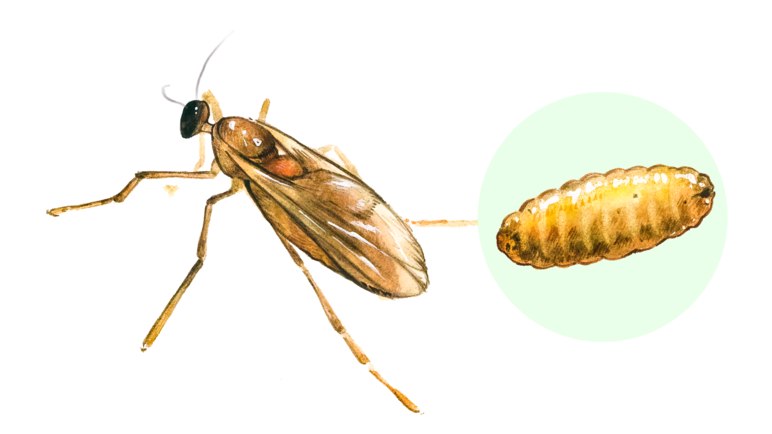🔷 Имаго светло-желтого цвета с черной головой. По виду напоминает комара. Длина самки 1,5 мм, самца - 1 мм. Самка имеет длинный яйцеклад, превосходящий длину тела вдвое. Имаго живет 1-2 дня.