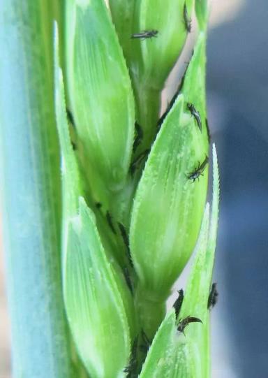 🔸Взрослые трипсы повреждают колосовые чешуйки, цветочные пленки. За счёт сосущего ротового аппарата вредитель высасывает сок пшеницы, что ведет к белоколосости и щуплозернистости. Повреждение флагового листа у основания вызывает его скручивание, затрудняя процесс выхода колоса.