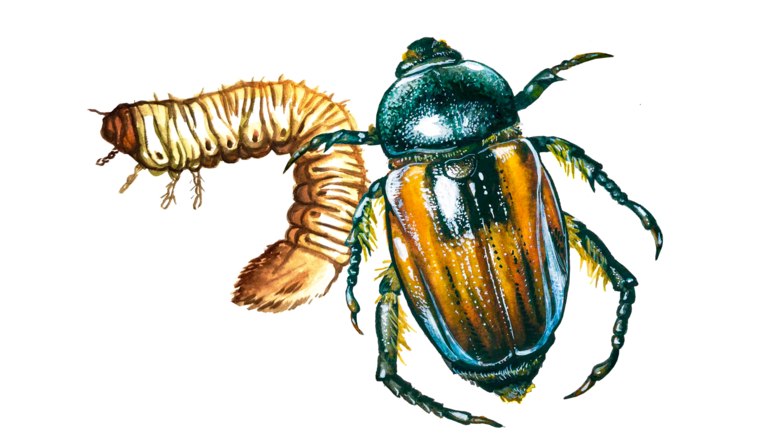 - Личинка длиной до 22 мм, С-образно изогнута с утолщённым задним концом, желтовато-белая.