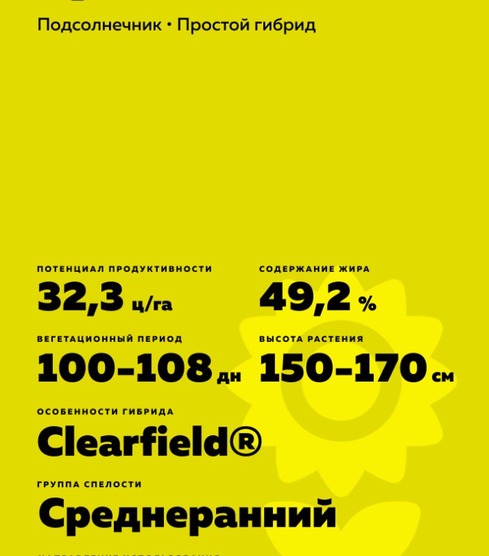 Helianthus annuus L.). Экстенсивный тип. Среднеранний. Производственная система - Clearfield ®. Заразихоустойчивый (А - Е).