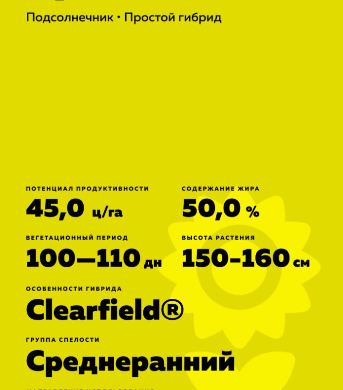 Helianthus annuus L.) Среднеранний интенсивный гибрид для высокой технологий возделывания. Гибрид устойчив к гербициду Евро-Лайтнинг® и пригоден для системы Clearfield®.