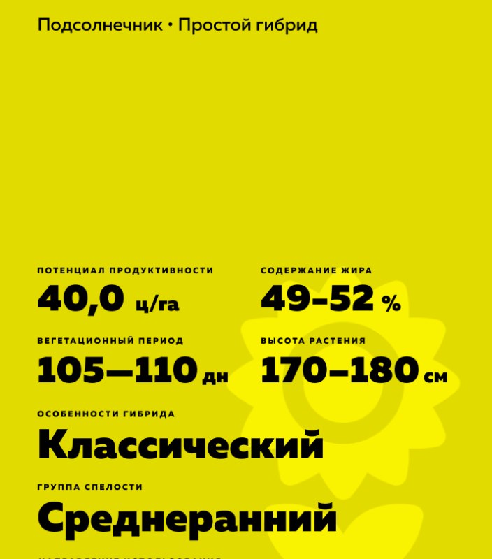 Содержание масла по данным оригинатора 49-52 %. - Гибрид отзывчив на удобрения и достаточное увлажнение.