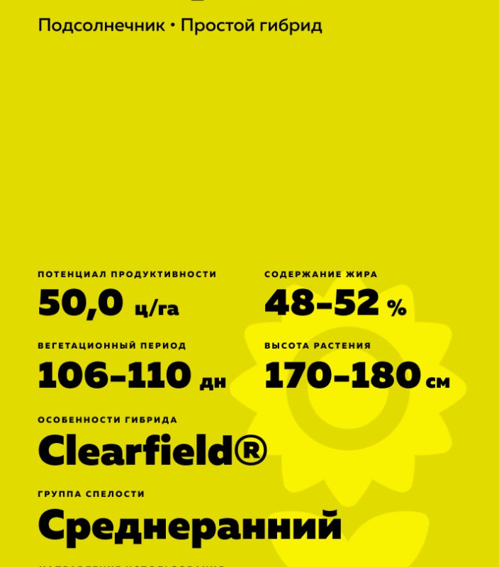 Helianthus annuus L.). Среднеспелый, оптимизирован для гербицидов Clearfield®. Экстенсивный. Назначение: линолевый.