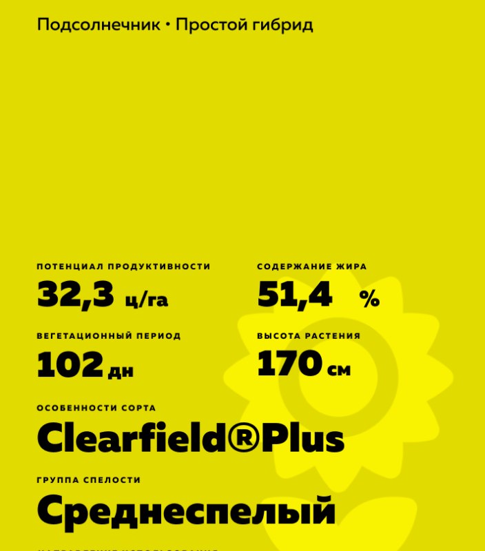 ЕС Генезис - гибрид подсолнечника (Helianthus annuus L. ) Среднеспелый. Устойчив к гербицидам группы имидазолинонов, система Clearfield®Plus.