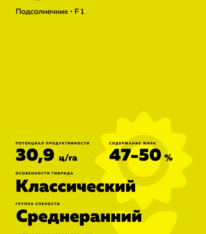 Helianthus annuus L.). Среднеранний. Высокомасличный. Устойчив к фомопсису и ложной мучнистой росе, умеренно устойчив к расам С и D заразихи.