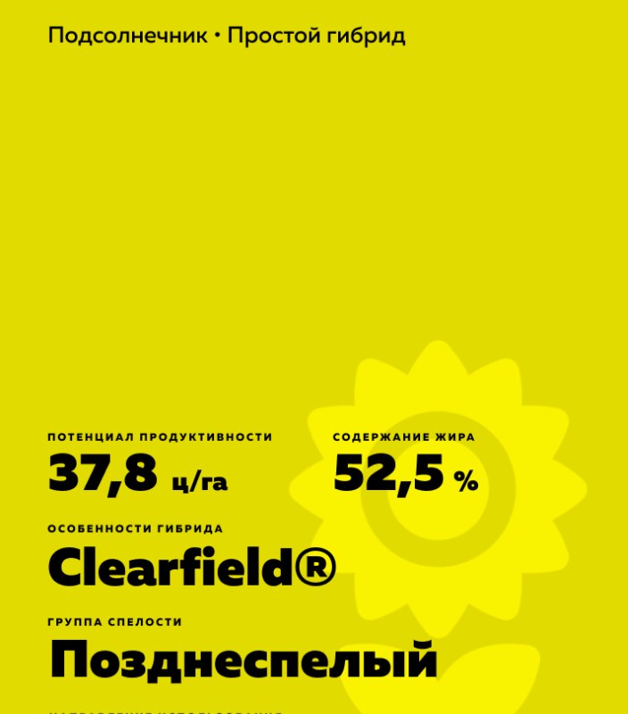 Helianthus annuus L.). Позднеспелый, устойчив к гербициду Евро-Лайтнинг® производственной системы Clearfield®. Гибрид предназначен для засушливых условий!