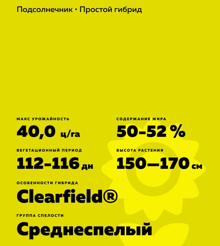 Helianthus annuus L.). Среднеспелый гибрид подсолнечника для производственной системы Clearfield®. Высокоинтенсивный.