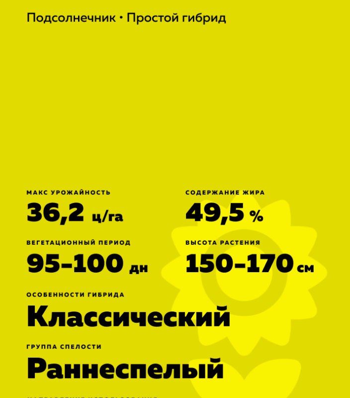 Helianthus annuus L.). Раннеспелый. Высокомасличный. Классический 5-рассовый гибрид. Масло можно использовать для производства биодизеля.