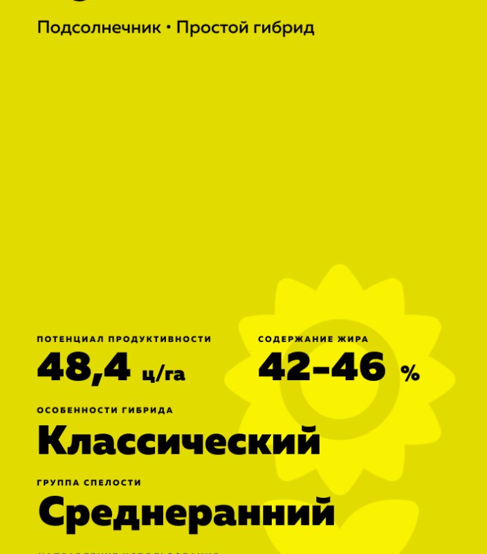 Helianthus annuus L.). Среднеранний. Классический. Гибрид предназначен для возделывания в засушливых регионах с риском поражения заразихой.