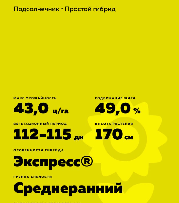 - Гибрид интенсивного типа. Устойчив к гербицидам, содержащим трибенурон — метил (SU) 50 г/га.