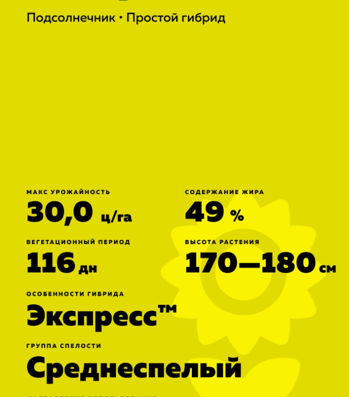 Helianthus annuus L.). Среднеспелый. Гибрид интенсивного типа. Технология Экспресс ®. Высокоолеиновый. Заразихоустойчивый.