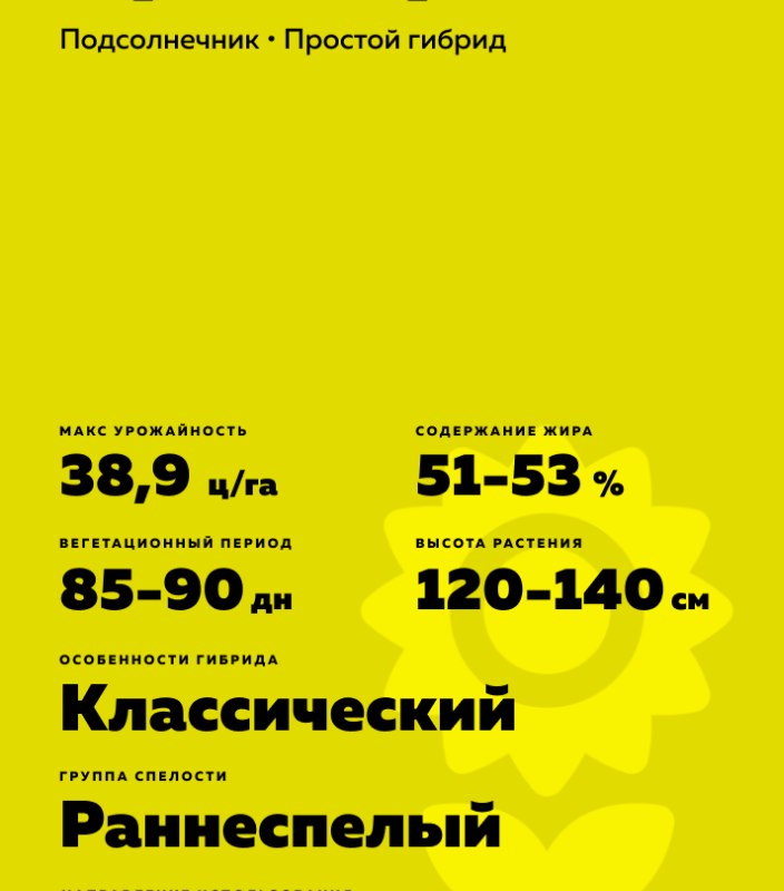 Helianthus annuus L.). Раннеспелый. Низкорослый. Высокомасличный, технологичный гибрид, относится к «северному» типу.