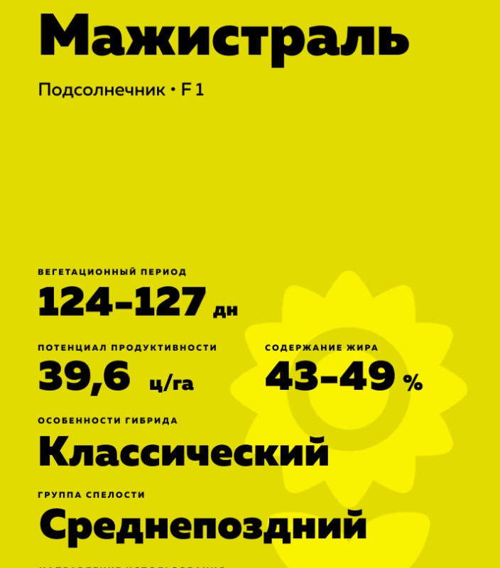 - По данным оригинатора: потенциал урожайности 55 ц/га, высокоолеиновый, с содержанием до 88% олеиновой кислоты. Масличный 50-55%.
