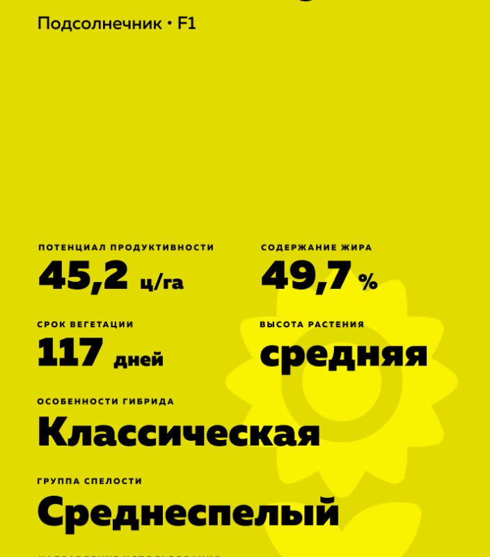 - Средняя урожайность в Центрально-Чернозёмном регионе - 35,2 ц/га. Масса 1000 семян - 59,8 г. Вегетационный период - 117 дней. Максимальная урожайность в Центрально-Чернозёмном регионе - 45,2 ц/га на Липецкой ГСИС Липецкой области в 2021 году. Среднее содержание жира в семенах - 49,7%. Сбор масла - 15,8 ц/га.