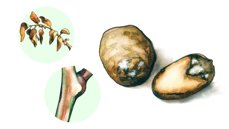 ❓ Как провести учет: проводят в период вегетации картофеля на листьях, стеблях, подземной части растений картофеля, начиная с фазы полных всходов. Учет распространенности и развития болезней проводят методом проб, располагая их по диагонали поля. В пробу входит 20 растений подряд на 1 ряду. На площади от 5 до 15 га осматривают 15-25 проб (300-500 растений), увеличивая их количество на 2 пробы на каждые последующие 5 га и располагая относительно равномерно по всей диагонали участка. В них устанавливают наличие или отсутствие заболевания и степень поражения растений, затем вычисляют распространенность и развитие болезней (в %). В случае увядания ботвы целесообразно выкопать куст и осмотреть его подземные части и основания стеблей. На них могут проявляться различные деформации, побурения, усыхания, затвердения, изменения окраски, а также налеты мицелия, спороношения возбудителя, свидетельствующие о наличии болезни.