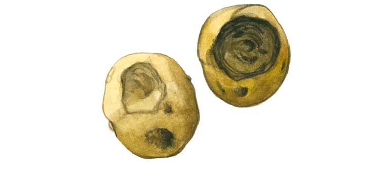 🟡На клубнях фомоз проявляется через 2—16 недель после уборки, но наиболее интенсивно — ко времени посадки картофеля, когда большинство больных клубней сгнивает. Вначале на поверхности образуются небольшие округлые тёмные вдавленные твёрдые пятна с отчётливой границей между больной и здоровой тканями. В дальнейшем пятна увеличиваются в диаметре и углубляются, превращаясь в язвы с плотно натянутой кожурой. На разрезе клубня через язву видна бледно-коричневая ткань, распространяющаяся внутрь в виде конуса. В больной ткани выделяются полости, выстланные серым мицелием гриба возбудителя. Поражённая ткань отделяется от здоровой узкой полосой более интенсивной окраски. При повышенной влажности заметен серо-белый мицелий возбудителя, который формирует конидиальное спороношение (пикниды). Иногда пикниды выступают на поверхность через кожуру клубня.