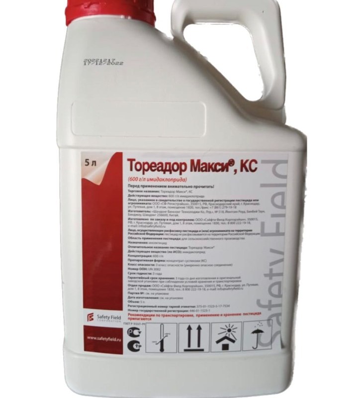 Совместимость: при необходимости применения препарата Тореадор Макси с фунгицидами и другими инсектицидами в каждом случае необходима предварительная проверка на физико-химическую совместимость смешиваемых компонентов. При приготовлении баковых смесей избегать прямого смешивания препаратов без предварительного разведения водой.