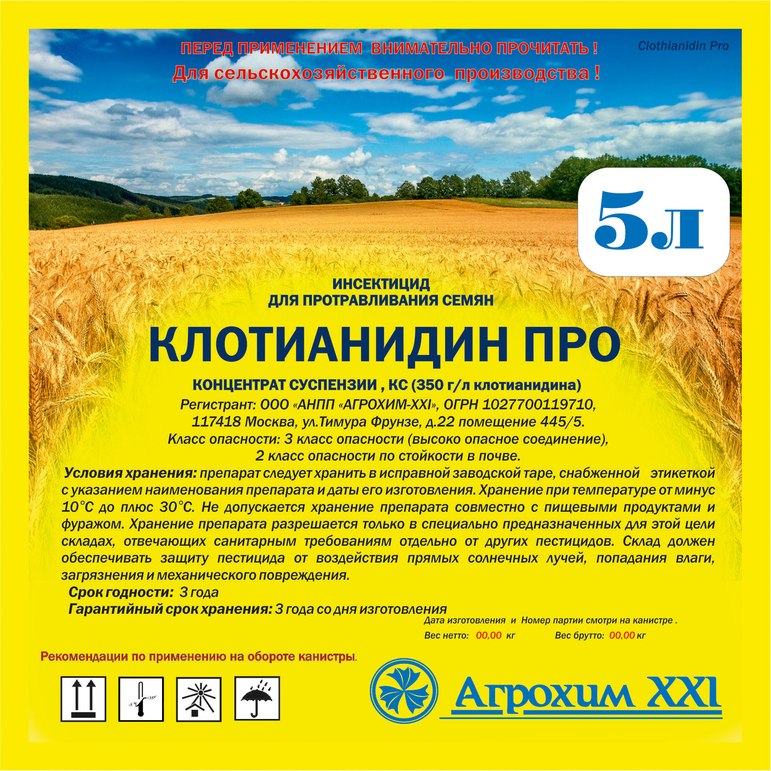 Взаимодействие с другими препаратами: Клотианидин Про совместим в баковых смесях с инсектицидными, фунгицидными протравителями, а также регуляторами роста, имеющими нейтральную химическую реакцию. Однако в каждом конкретном случае смешивая препараты следует проверять на физико-химическую совместимость и безопасность для культурных растений.