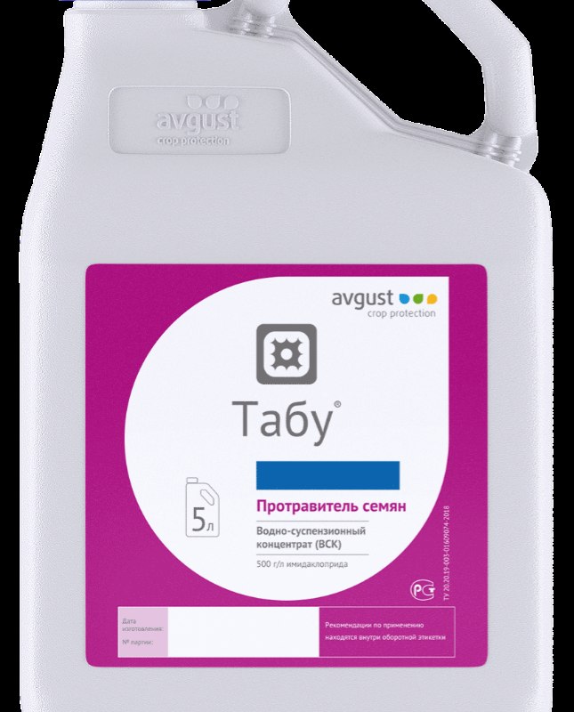 Особенности препарата: препаративная форма Табу – это современная сложная рецептура, в состав которой входят, кроме действующих веществ, яркий сигнальный краситель, прилипатель, смачиватель, специальные диспергаторы, загуститель, антифриз. Ее колоссальное преимущество состоит в том, что она обеспечивает равномерное нанесение действующих веществ на семена и создание на их поверхности очень качественной, прокрашенной, достаточно прочной пленки препарата, не осыпающейся после высыхания.