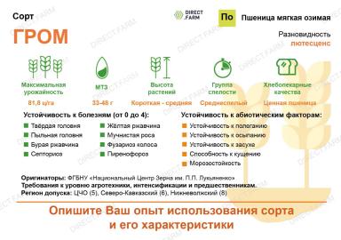 - Сорт Гром рекомендован для возделывания по большинству предшественников, в том числе по пропашным. Не рекомендован к посеву по колосовым. Категорически запрещено выращивание пшеницы Гром после кукурузы на зерно!!!