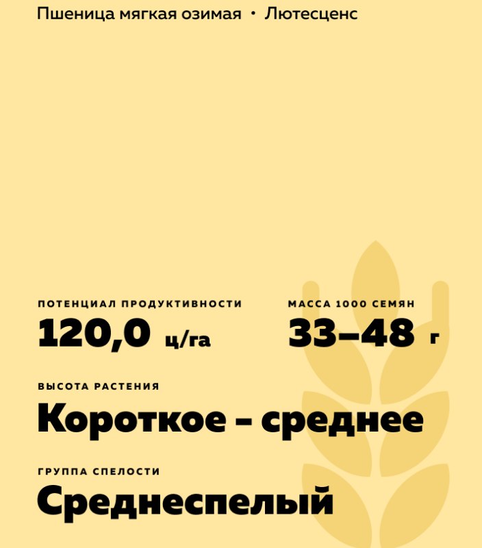- По данным оригинатора потенциал урожайности 120 ц зерна с 1 га.