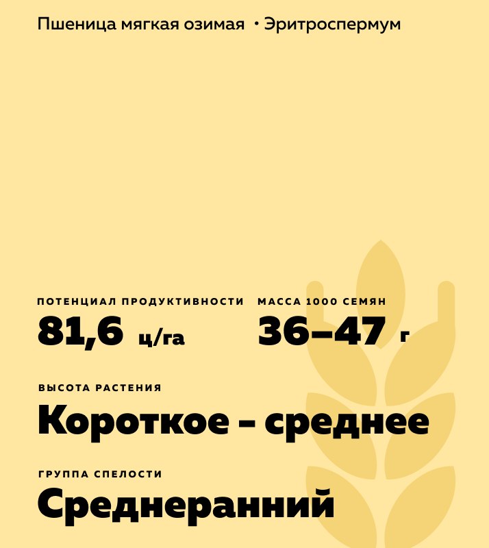 Triticum aestivum L.). Низкостебельный, высокопластичный, высокоурожайный сорт с отличным и хорошим качеством зерна, характеризуется высокой зимостойкостью, жаростойкостью и засухоустойчивостью, реализует свой потенциал при интенсивных технологиях.
