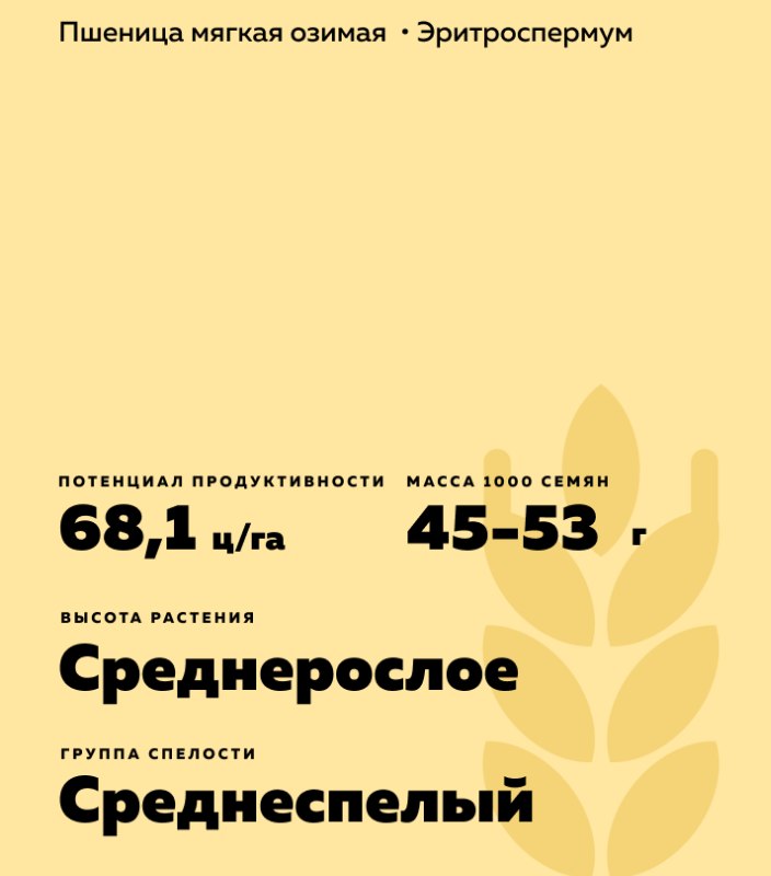 Triticum aestivum L.). Среднеспелый, устойчивый сорт к стрессам и заболеваниям. Ценное качество зерна с высоким содержанием протеина и хорошими хлебопекарными свойствами.