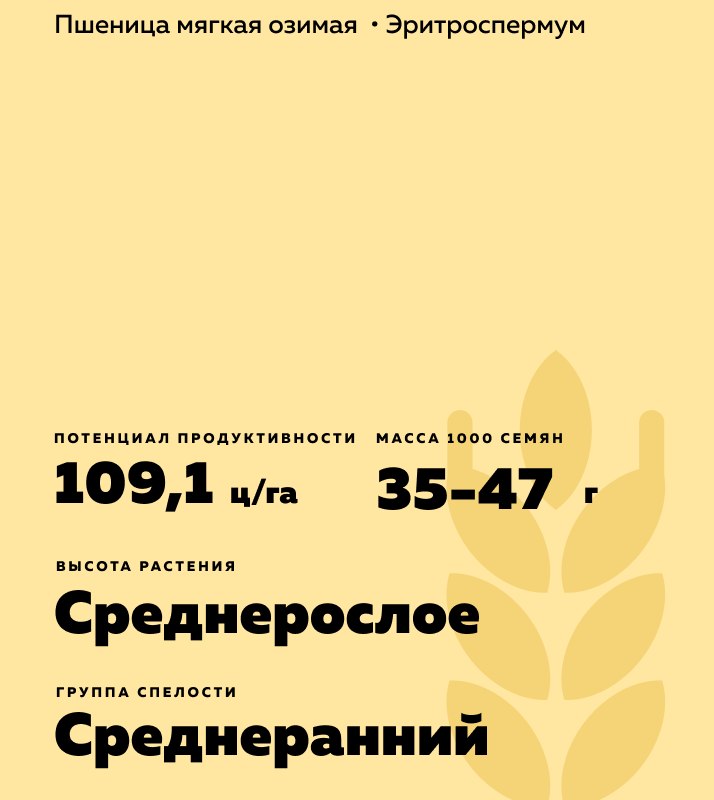Triticum aestivum L.). Среднеранний, среднерослый сорт, имеет высокий потенциал урожайности, лучше других сортов использует средний и низкий агрофон. Имеет неплохую комплексную устойчивость к болезням.