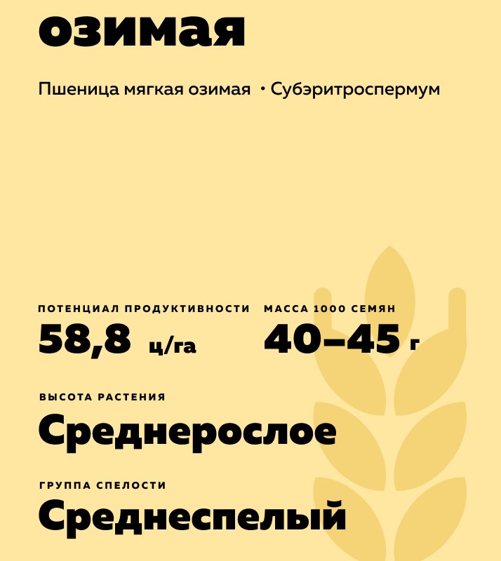 Triticum aestivum L.). Среднеспелый, среднерослый. Достоинства сорта: высокая зимостойкость, стабильная урожайность, технологичность, хорошее качество зерна.