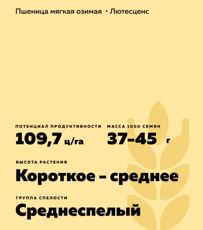 Triticum aestivum L.). Среднеспелый сорт, устойчив к полеганию. Главная цель использования: получение высоких урожаев высококачественного зерна.