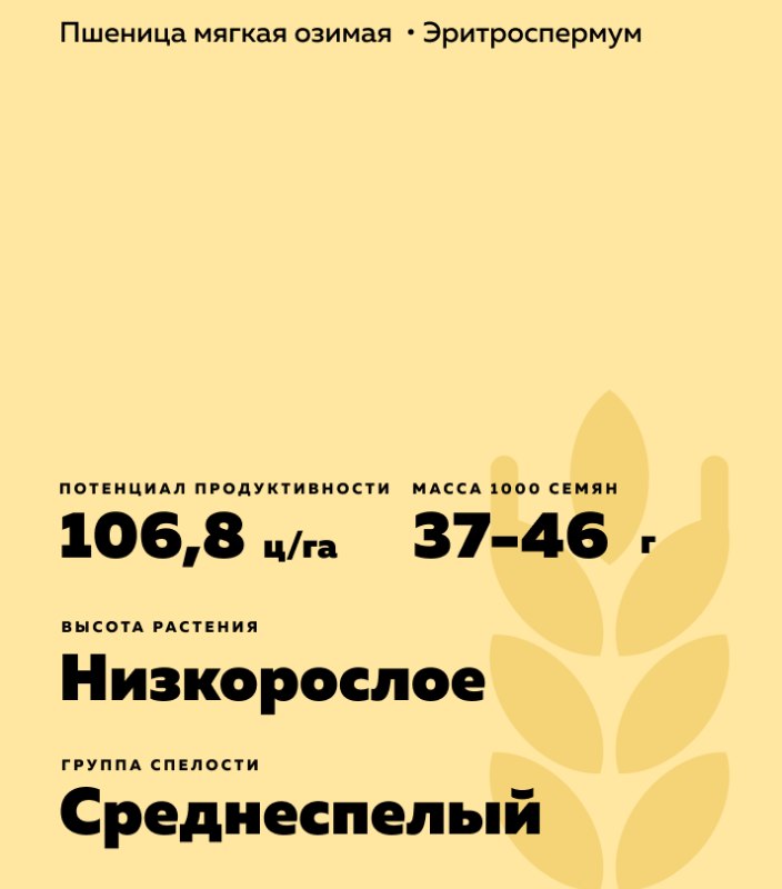 - Масса 1000 зерен - 37-46 г. По данным оригинатора масса 1000 зёрен - 42,4-48,6 г.