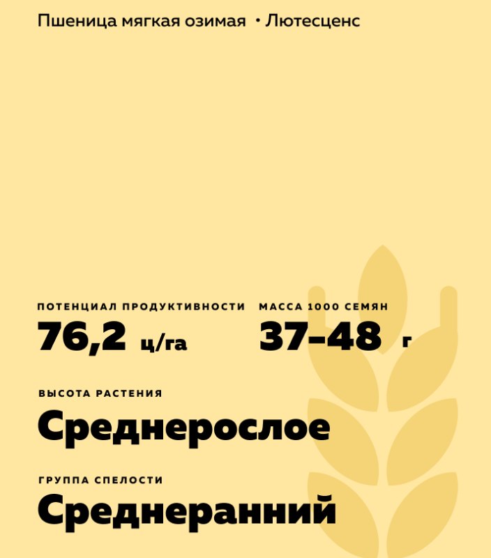 Среднеранний. интенсивного типа, устойчив к полеганию и осыпанию.