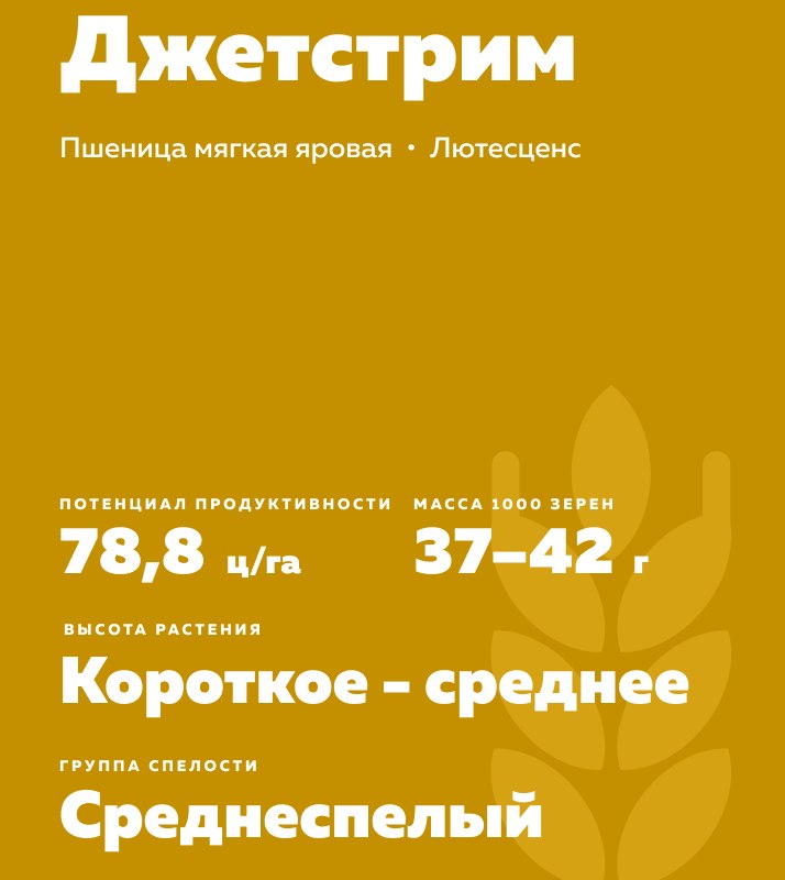 КВС Джетстрим ® - сорт мягкой яровой пшеницы (Triticum aestivum L.). Среднеспелый, низкорослый. Высокопродуктивный. Устойчив к полеганию.