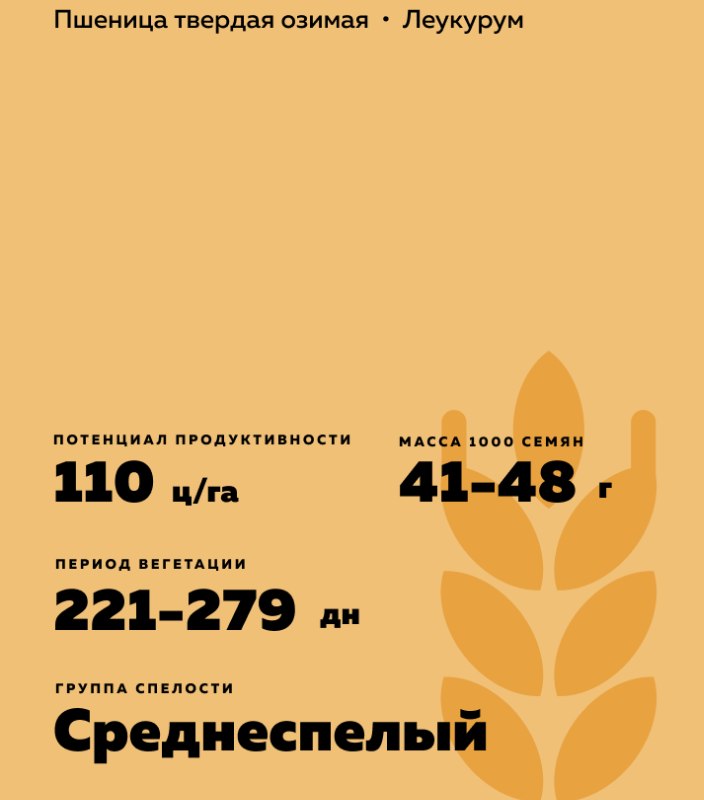 Одари ® - сорт твердой озимой пшеницы (Triticum durum Desf.). Цель использования: получение зерна для изготовления высококачественных макаронно-крупяных изделий