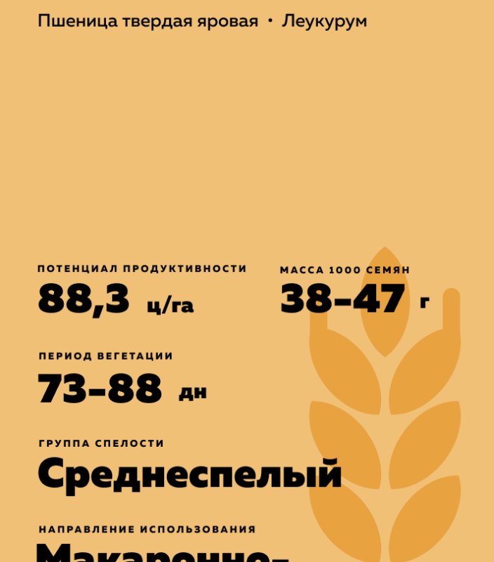 Triticum durum Desf.). Среднеспелый. Ценный сорт для макаронной промышленности. Компактная высота, устойчивость к полеганию и ломке колоса.