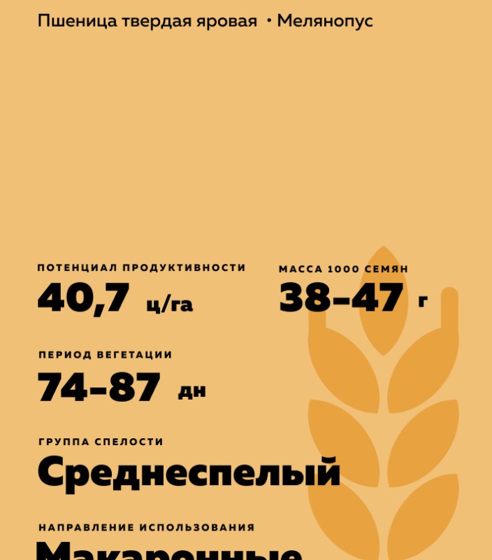 Triticum durum Desf.). Среднеспелый. Интенсивный сорт, макаронно-крупяного использования. Основные достоинства - высокое качество клейковины, продуктивность.