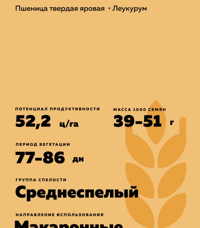 Triticum durum Desf.). Среднеспелый. Основное достоинство – высокое качество зерна, клейковины, макарон, хлеба.