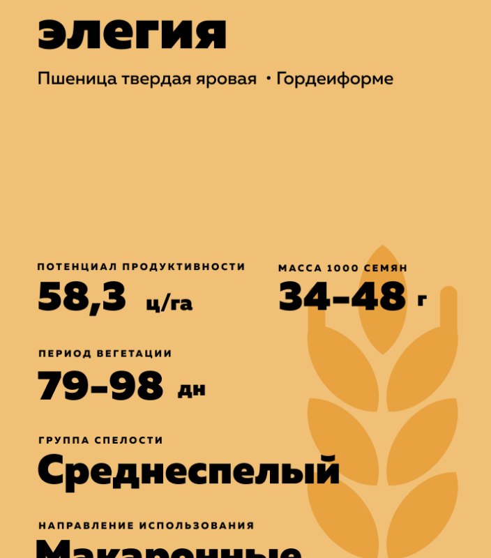 Донская элегия ® - сорт пшеницы твердой яровой (Triticum durum Desf.). Среднеспелый. Макаронные качества удовлетворительные. Высокий урожай зерна обеспечивается высокофертильным колосом и крупным зерном.
