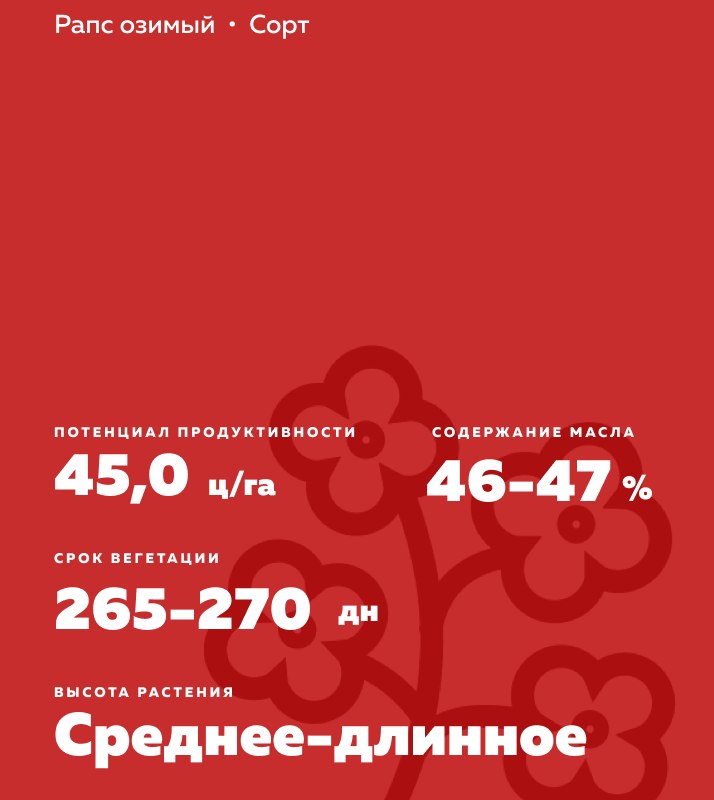 - Стабильный сорт рапса озимого, характеризуется устойчивостью к стрессовым факторам, выдерживает часто наблюдающиеся в условиях юга РФ высокие температуры и дефицит влаги.