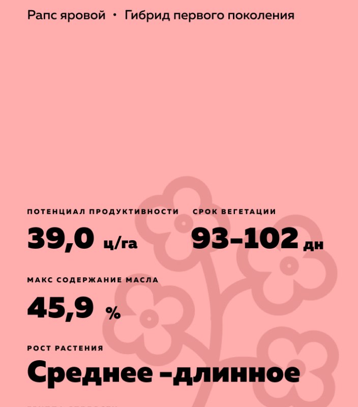 Brassica napus var. napus). Гибрид 00 типа (безэруковый, низкоглюкозинолатный). Среднеспелый. Непревзойденная стабильность урожая. Легко спутать с озимым.
