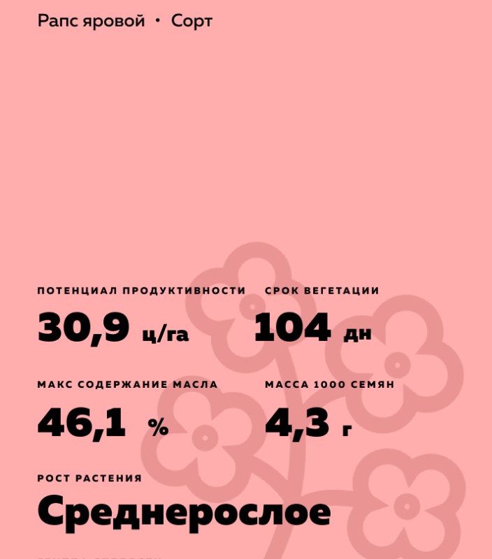 - Содержание жира в семенах 46,1%. Вегетационный период 104 дня.
