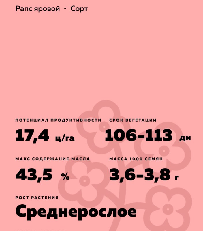 Brassica napus var. napus). Сорт 00 типа (безэруковый, низкоглюкозинолатный). Рекомендуется для возделывания на семена и для кормовых целей.