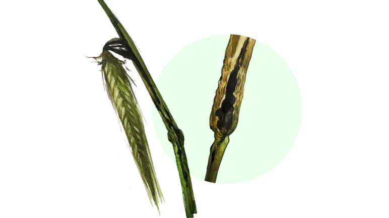 Первые симптомы болезни могут появиться на растениях уже через 40 дней после всходов, обычно проявление приурочено к фазе выхода в трубку-колошения. Больные растения чахлые, зачастую неумеренно кустятся.